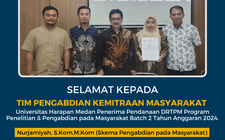 Rektor Universitas Harapan (UnHar) Medan, Prof. Drs. Sriadhi, S.T., M.Pd., M.Kom., Ph.D., mengucapkan selamat kepada tim Pengabdian Kemitraan Masyarakat UnHar Medan yang berhasil meraih pendanaan dari Direktorat Riset, Teknologi, dan Pengabdian kepada Masyarakat (DRTPM) dalam Program Penelitian dan Pengabdian pada Masyarakat Batch 2 Tahun Anggaran