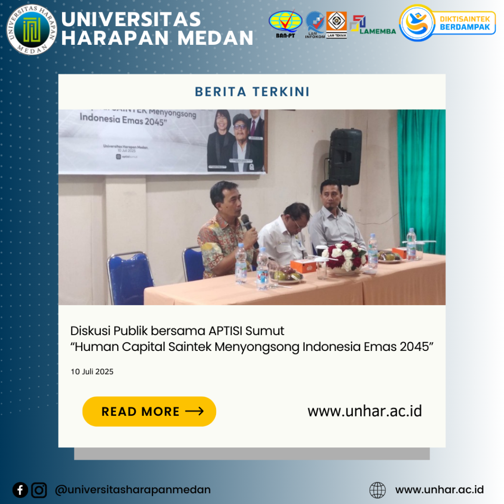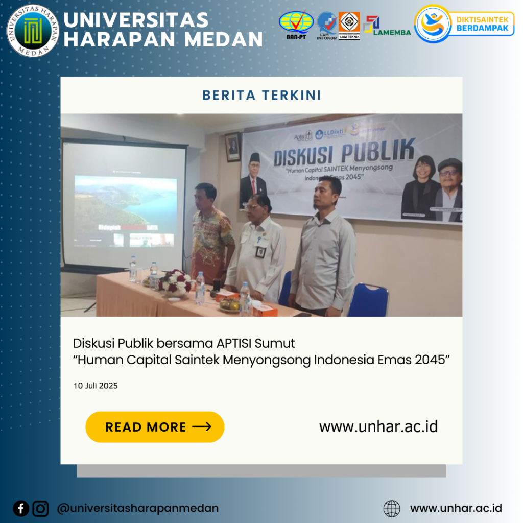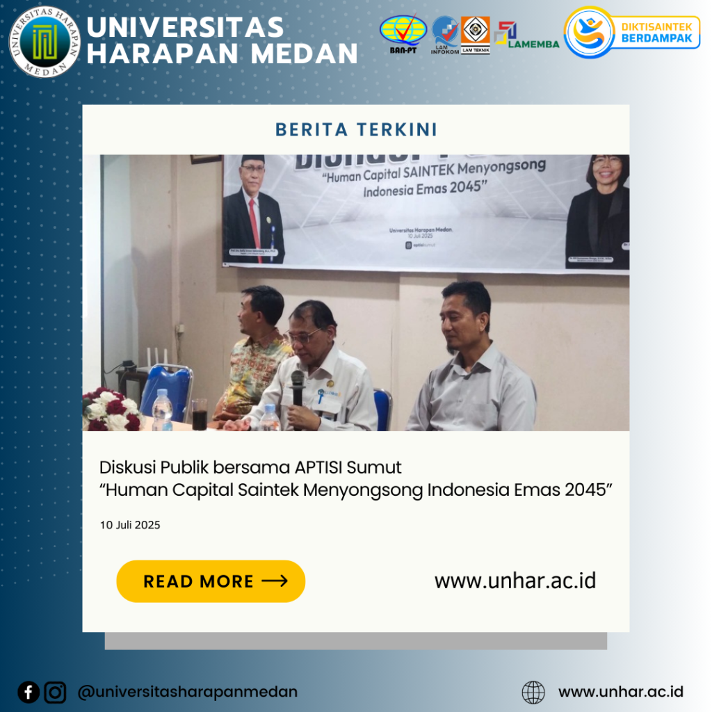 Medan, 10 Juli 2025 – Asosiasi Perguruan Tinggi Swasta Indonesia (APTISI) Wilayah Sumatera Utara menyelenggarakan kegiatan Diskusi Publik bertema “Human Capital Saintek Menyongsong Indonesia Emas 2045” bertempat di Aula Fakultas Teknik dan Komputer Universitas Harapan (UnHar) Medan. Kegiatan yang dilaksanakan secara luring dan daring ini dihadiri oleh pimpinan Perguruan Tinggi Swasta (PTS) di wilayah Sumatera Utara serta para anggota APTISI Sumut.