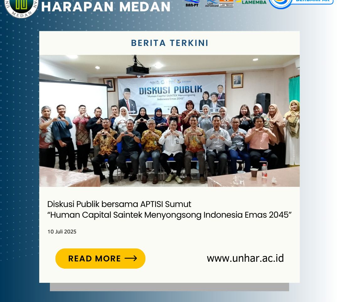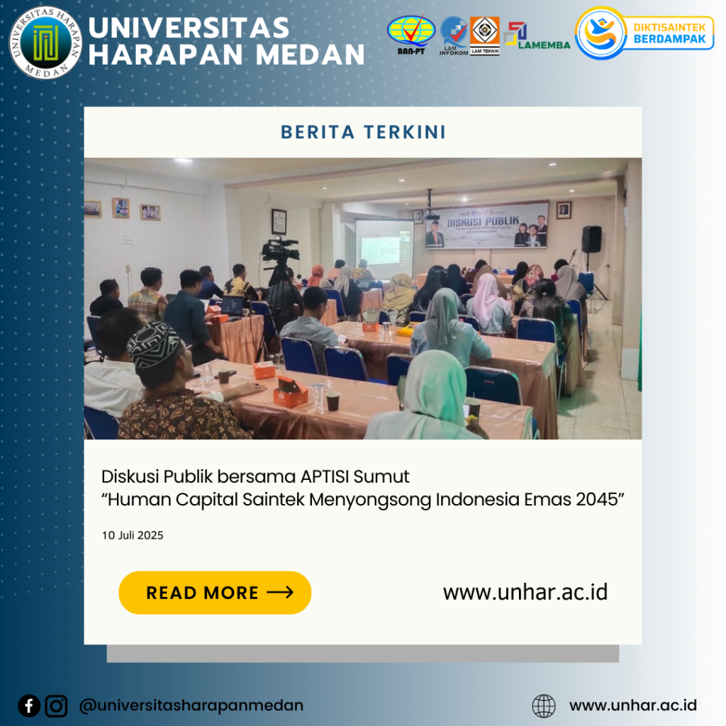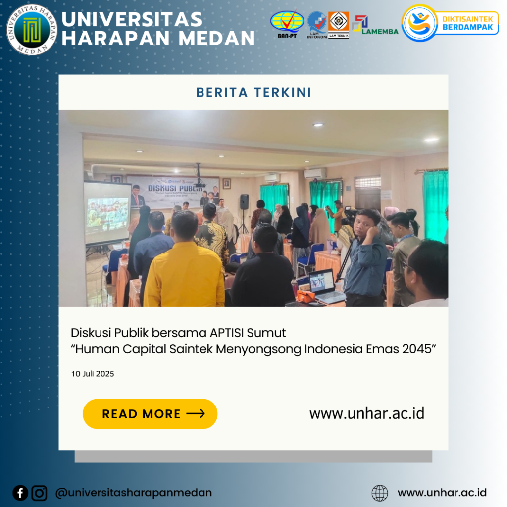 Medan, 10 Juli 2025 – Asosiasi Perguruan Tinggi Swasta Indonesia (APTISI) Wilayah Sumatera Utara menyelenggarakan kegiatan Diskusi Publik bertema “Human Capital Saintek Menyongsong Indonesia Emas 2045” bertempat di Aula Fakultas Teknik dan Komputer Universitas Harapan (UnHar) Medan. Kegiatan yang dilaksanakan secara luring dan daring ini dihadiri oleh pimpinan Perguruan Tinggi Swasta (PTS) di wilayah Sumatera Utara serta para anggota APTISI Sumut.