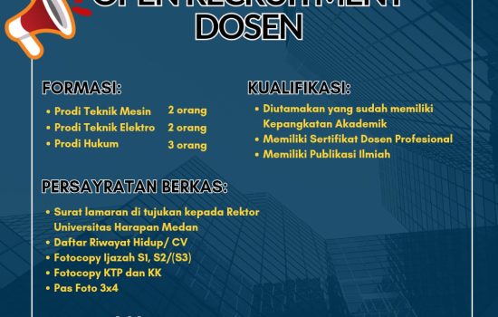 Universitas Harapan Medan membuka lowongan pekerjaan sebagai Dosen dengan syarat sebagai berikut: Formasi Kualifikasi: Persyaratan…