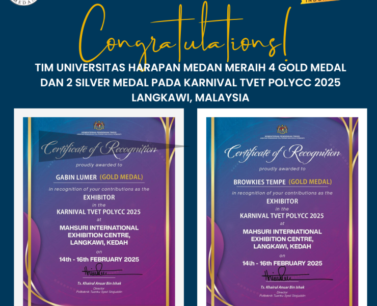 Tim Universitas Harapan (UnHar) Medan yang berhasil meraih 4 Medali Emas dan 2 Medali Perak pada Karnival TVET POLYCC 2025 yang diselenggarakan di Mahsuri International