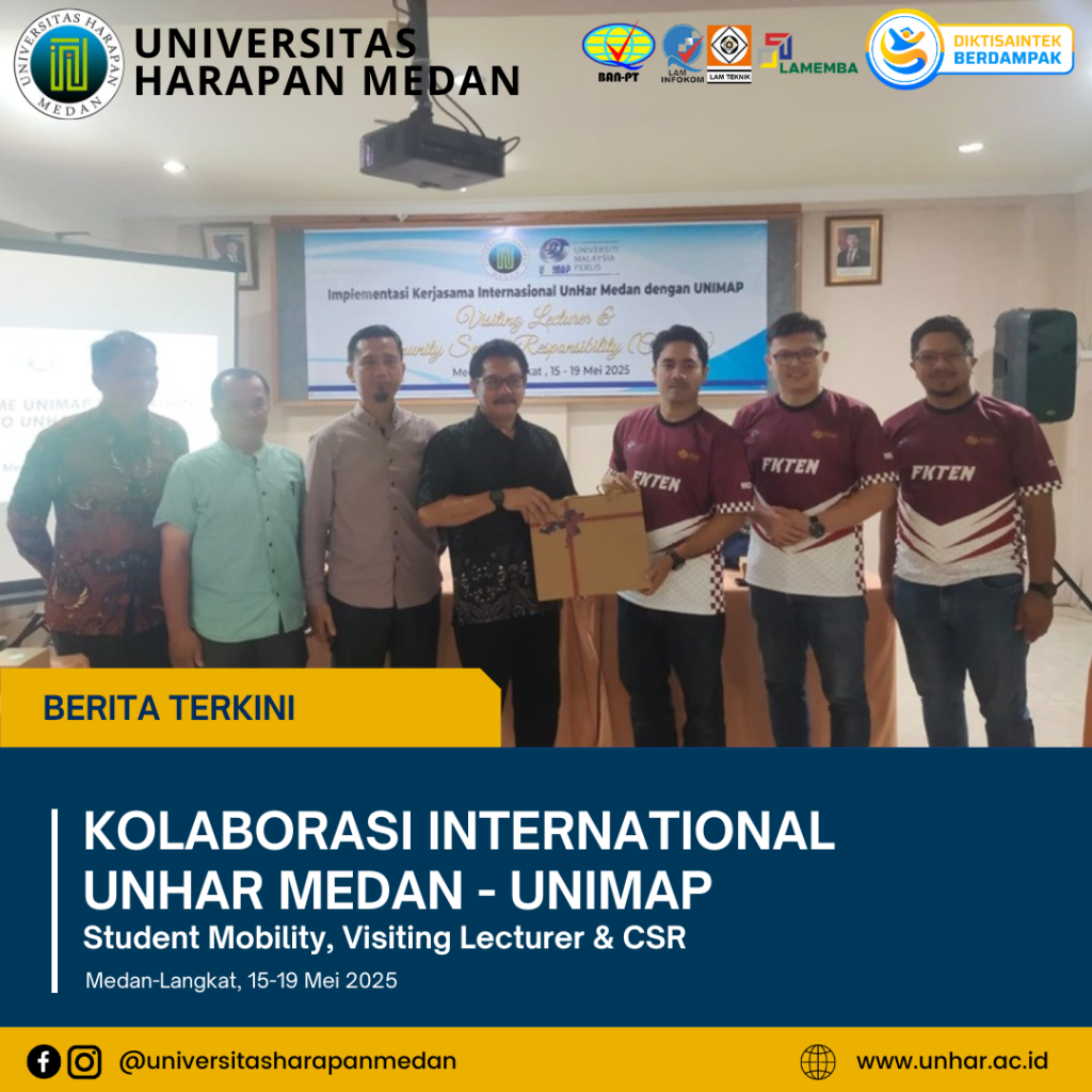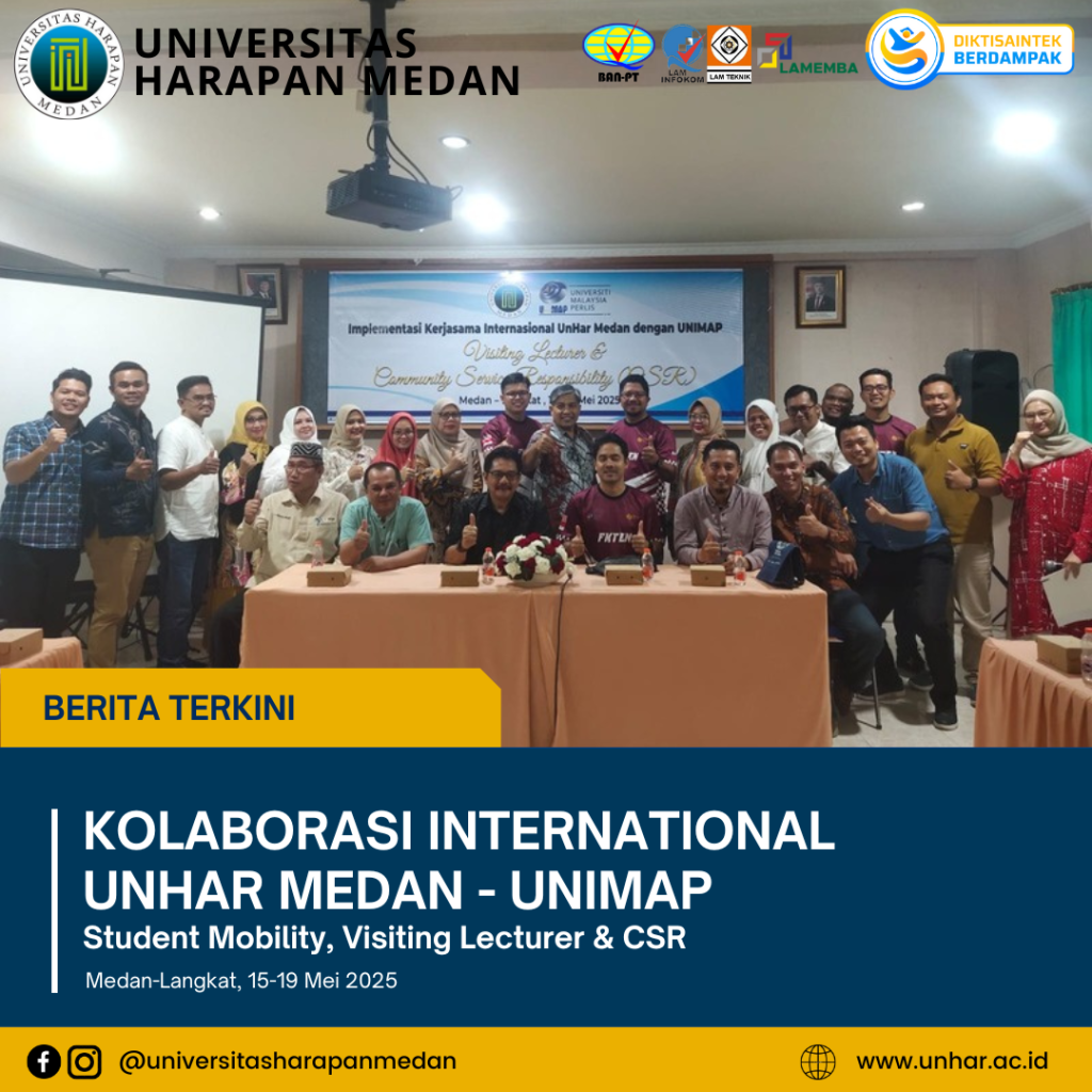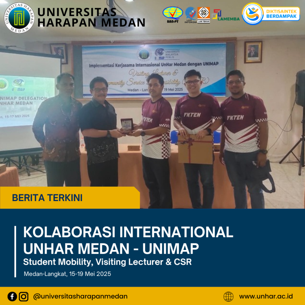 Pada tanggal 15-19 Mei 2025, Universitas Harapan (UnHar) Medan dan University Malaysia Perlis (UniMAP) melakukan kolaborasi internasional yang melibatkan kegiatan Student Mobility dan Visiting Lecturer di Kampus 3 UnHar Medan, Jl. HM Joni No 70, C Medan. Kolaborasi ini merupakan langkah penting dalam memperkuat hubungan pendidikan antarnegara dan memberikan manfaat bagi civitas akademika kedua universitas.