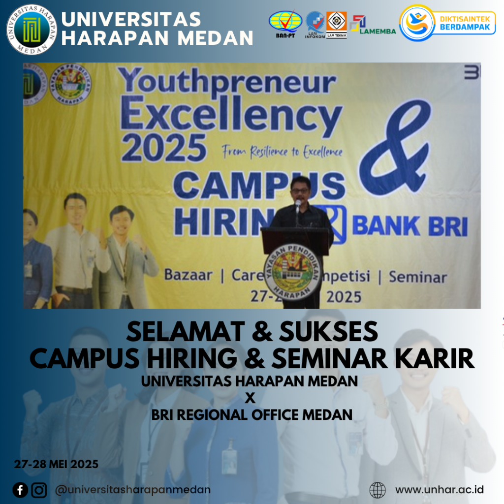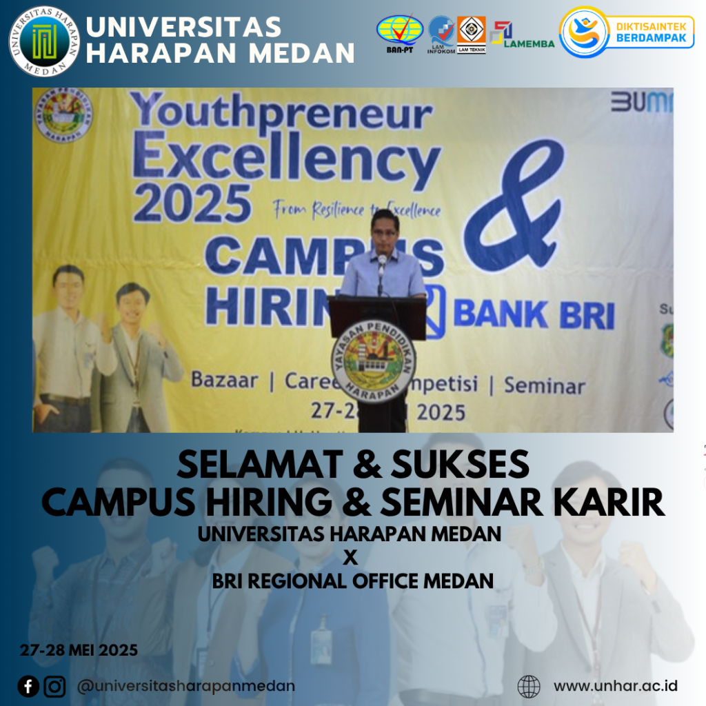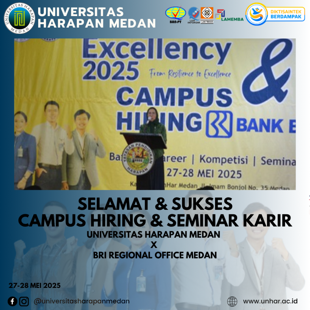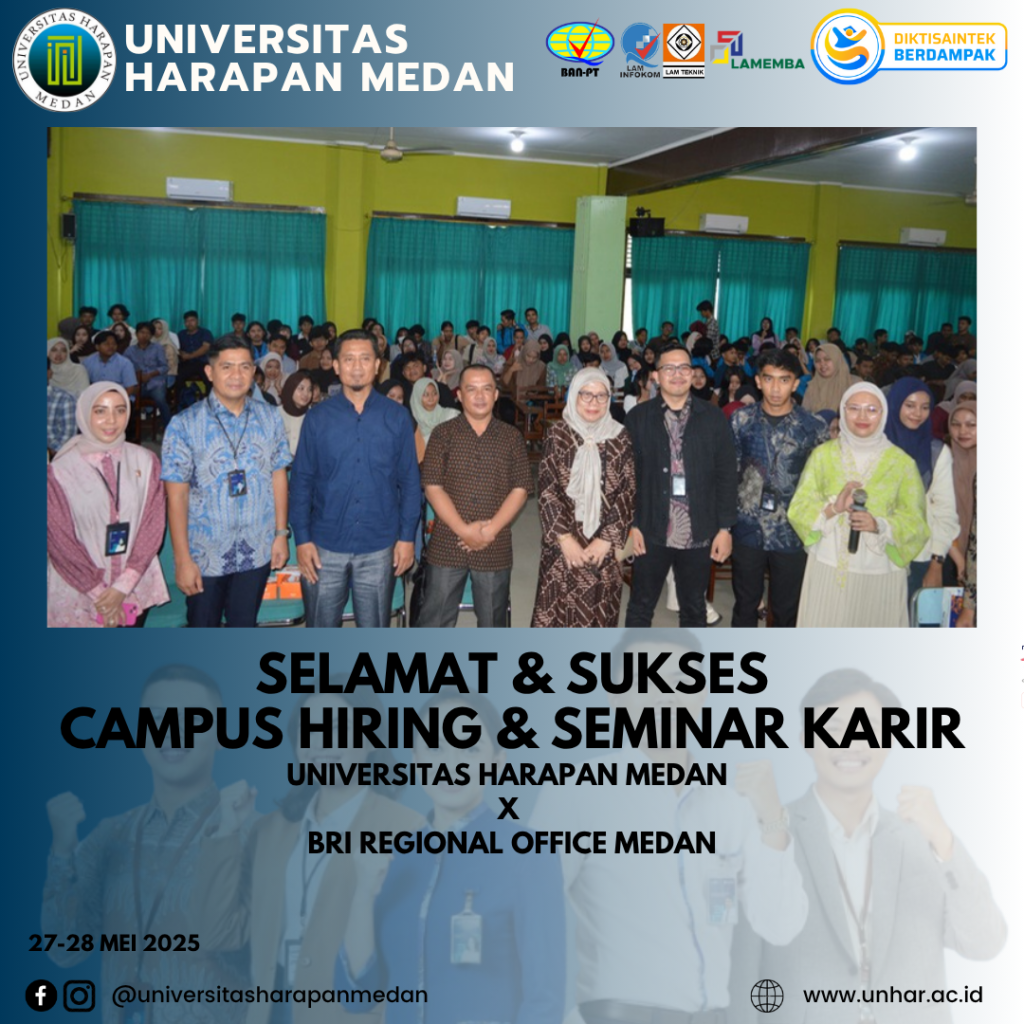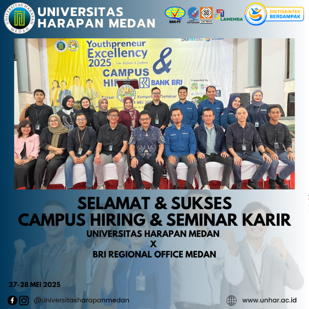 Medan, 28 Mei 2025 – Universitas Harapan (UnHar) Medan kembali menorehkan prestasi membanggakan melalui terselenggaranya kegiatan Campus Hiring yang bekerja sama dengan BRI Regional Office Medan. Kegiatan ini dilaksanakan selama dua hari, pada tanggal 27–28 Mei 2025, bertempat di Aula Yaspendhar, Kampus I UnHar Medan, Jl. Imam Bonjol No. 35 Medan.