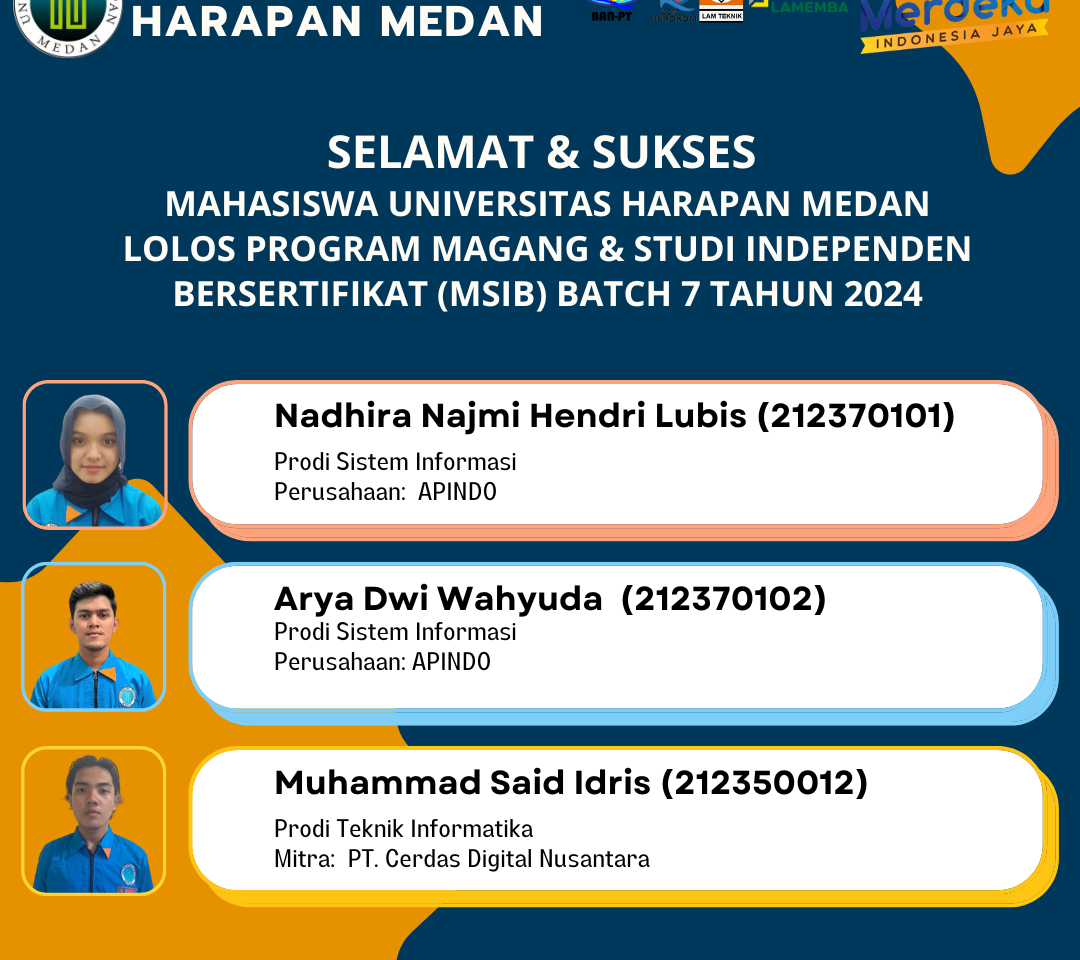 Universitas Harapan Medan (UnHar) Medan dengan bangga mengucapkan selamat kepada para mahasiswa yang berhasil lolos dalam Program Magang dan Studi Independen Bersertifikat (MSIB) Batch 7 Tahun 2024. Prestasi ini merupakan bukti dedikasi dan semangat mahasiswa UnHar Medan dalam mengejar ilmu dan pengalaman di dunia profesional.