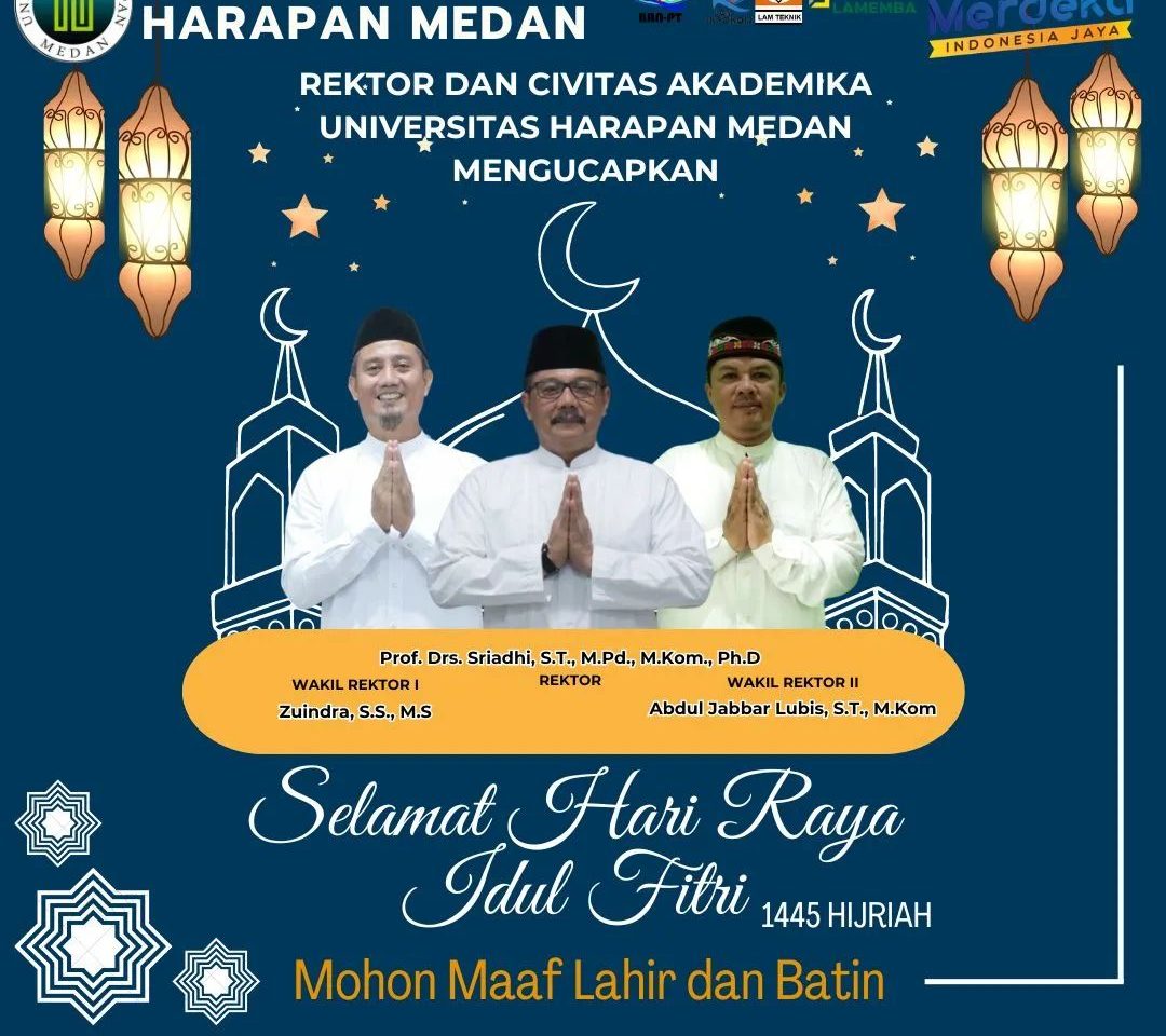 Rektor dan Civitas Akademika Universitas Harapan Medan mengucapkan Taqabbalallahu Minna wa Minkum Taqabbal yaa Karim. Selamat Hari Raya Idul Fitri 1445 Hijriah. Mohon Maaf Lahir dan Batin.