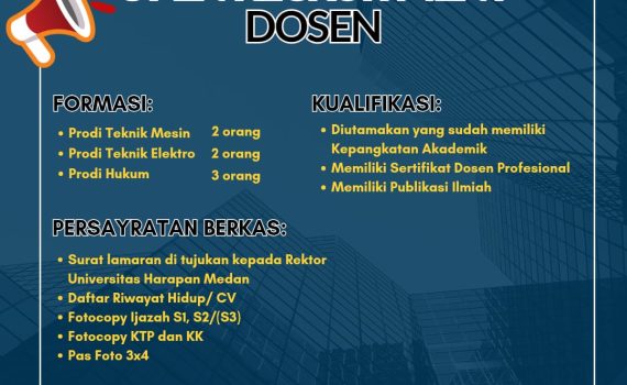 Universitas Harapan Medan membuka lowongan pekerjaan sebagai Dosen dengan syarat sebagai berikut: Formasi Kualifikasi: Persyaratan Berkas: Lamaran dikirim langsung ke:📍Biro