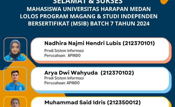 Universitas Harapan Medan (UnHar) Medan dengan bangga mengucapkan selamat kepada para mahasiswa yang berhasil lolos dalam Program Magang dan Studi