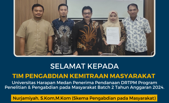 Rektor Universitas Harapan (UnHar) Medan, Prof. Drs. Sriadhi, S.T., M.Pd., M.Kom., Ph.D., mengucapkan selamat kepada tim Pengabdian Kemitraan Masyarakat UnHar