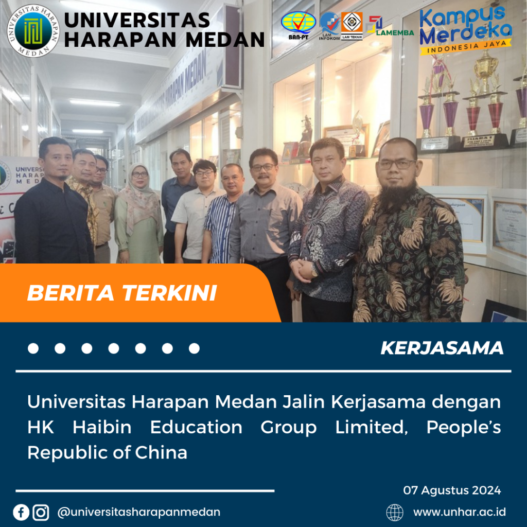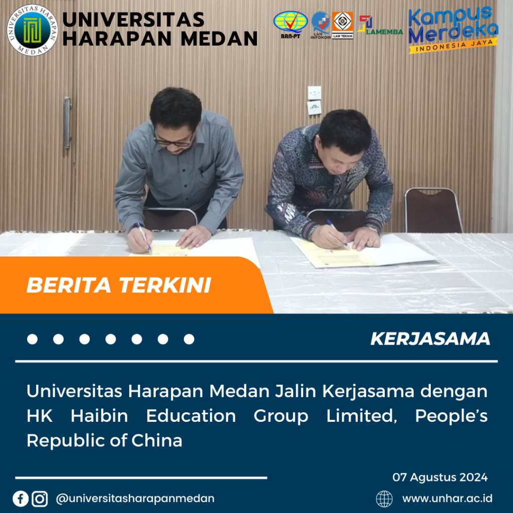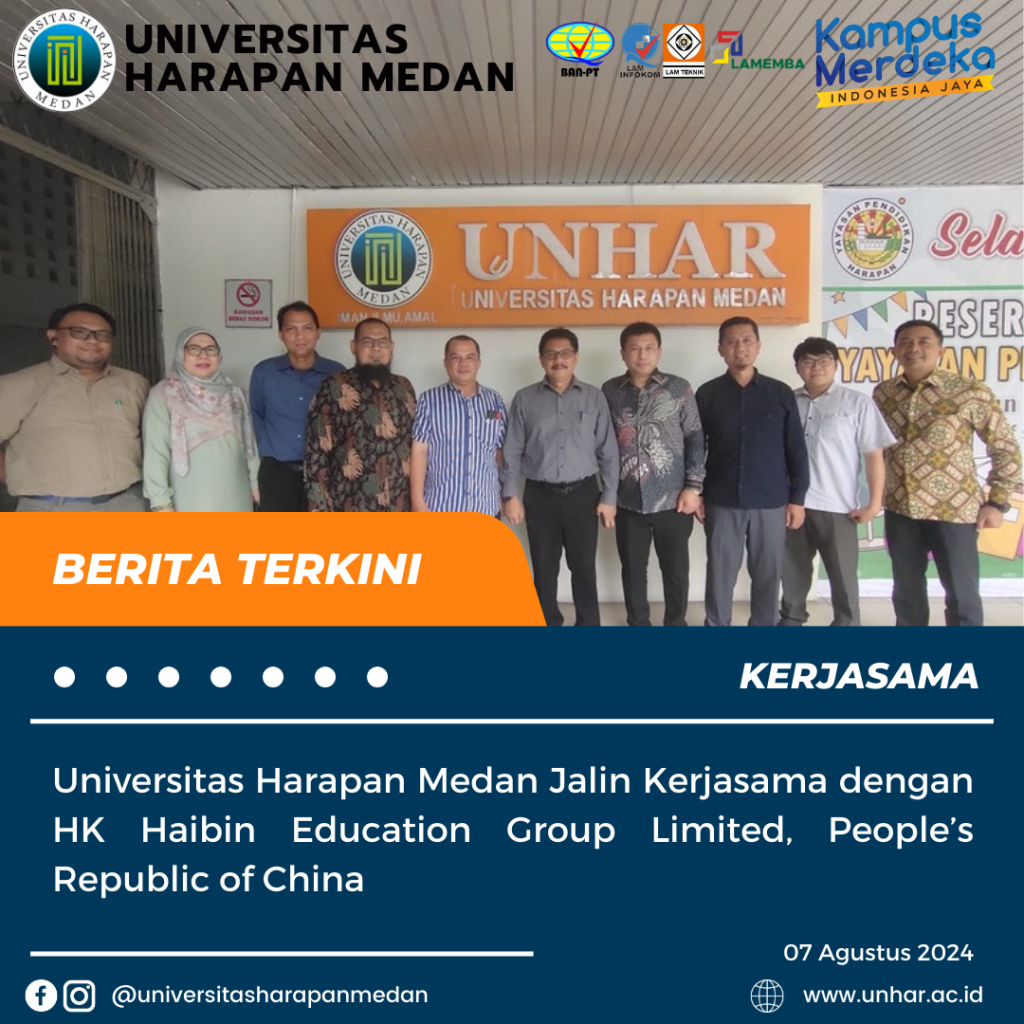 Rabu, 07 Agustus 2024 – Universitas Harapan (UnHar) Medan menjalin Kerjasama International dengan HK Haibin Education Group Limited, People’s Republic of China. Kegiatan dilaksanakan di Biro Rektorat UnHar Medan Jl. Imam Bonjol No. 35 Medan.