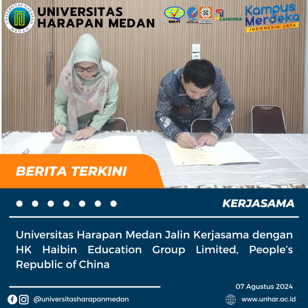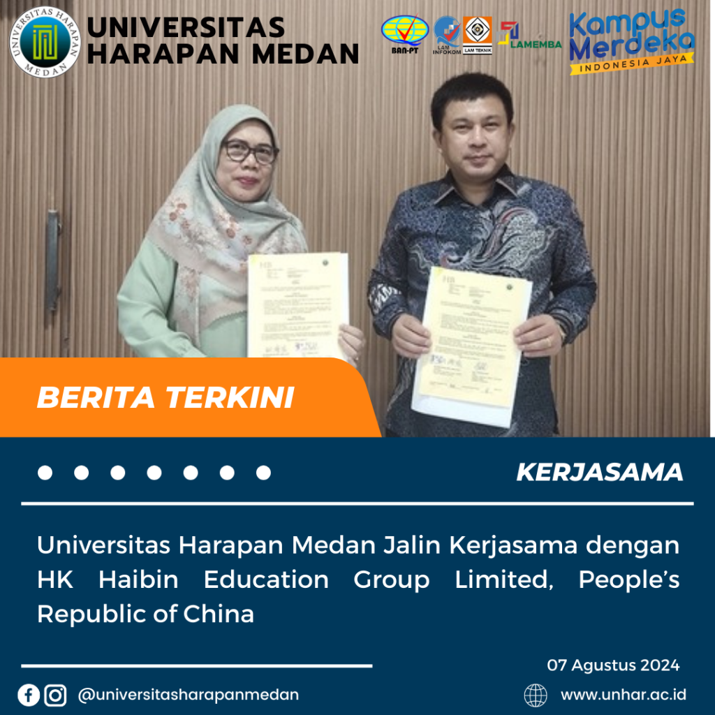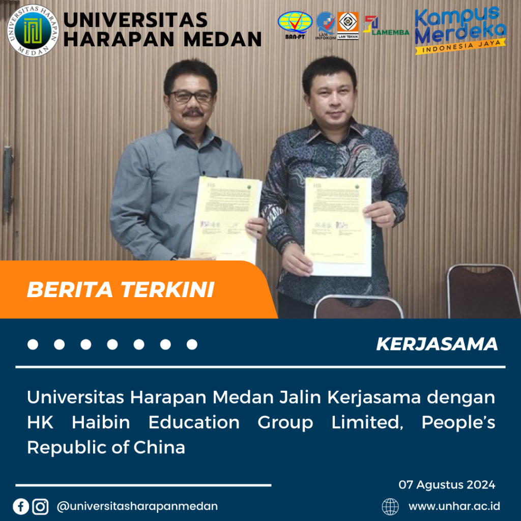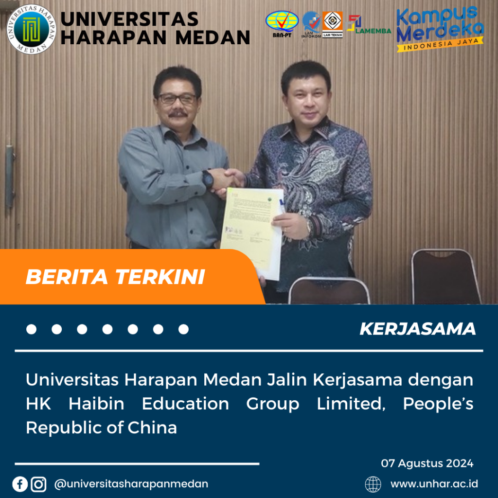 Rabu, 07 Agustus 2024 – Universitas Harapan (UnHar) Medan menjalin Kerjasama International dengan HK Haibin Education Group Limited, People’s Republic of China. Kegiatan dilaksanakan di Biro Rektorat UnHar Medan Jl. Imam Bonjol No. 35 Medan.